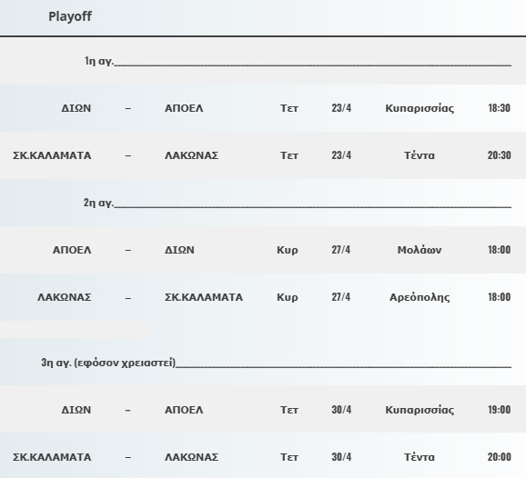 Οι 2 ομάδες που θα συμπληρώσουν πρώτες 3 νίκες, παραμένουν στην Α1. Οι ηττημένες υποβιβάζονται. Εδώ, μεταφέρονται οι νίκες από την κανονική περίοδο και πλεονέκτημα έχει ο Σπαρτιατικός με 2-0 έναντι του Πάμισου. Στο άλλο ζευγάρι οι νίκες είναι μοιρασμένες σε 1-1.